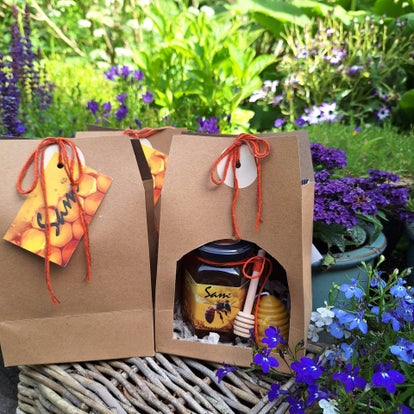 Een cadeaupakket met een potje honing á 350 gram, een kaarsje gemaakt van echte bijenwas, een houten honing lepel, een informatie kaartje met bijenweetjes en een zakje wilde bloemenzaadjes. Dit in een leuke cadeauverpakking.